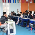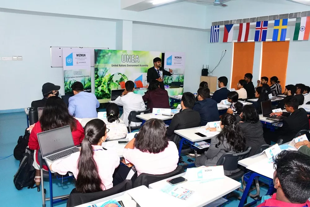 Speaking on the occasion, Ms. Ukil welcomed all delegates and expressed her delight in the fact that so many students had chosen to participate in the proceedings. She wished the participants, the Executive Board and all dignitaries fruitful discussions, and said that we have come together to listen to young minds working out solutions for a troubled world. Our School Leader and Vice Chairperson received flags of the UN and representative countries from the two Committees – the United Nations Environment Assembly, and the United Nations General Assembly Committee on Disarmament and International security. She then declared WIZMUN 2023 open.